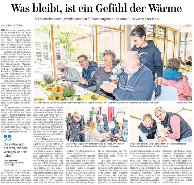 Der Kieler Wohlfühlmorgen richtet sich an Menschen, die von Armut oder Wohnungslosigkeit betroffen sind, und bietet ihnen einen sorgenfreien Tag mit kostenfreien Angeboten. Einmal im Jahr können die Gäste ein reichhaltiges Frühstück genießen, sich verwöhnen lassen – etwa mit Haarschnitten, Massagen oder Kosmetikbehandlungen – und medizinische sowie soziale Unterstützung erhalten. Auch Kleidung, Hygieneprodukte und Tierarztversorgung stehen zur Verfügung.
